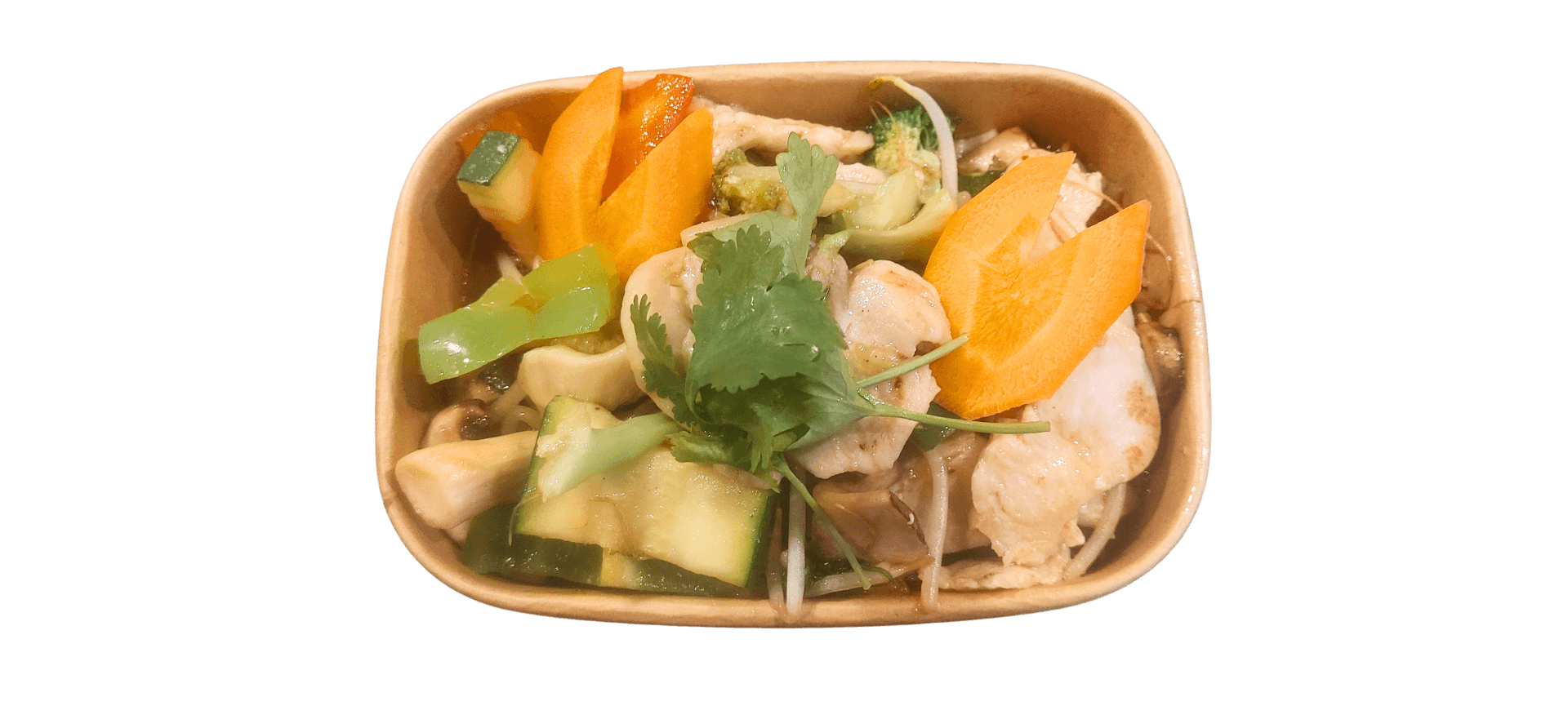 Geroerbakte kipfilet, biefstuk of garnalen met rijke hoeveelheid groente.