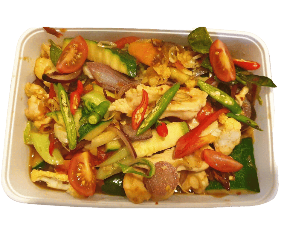 Phad Ta Krai Siam – Pittige gebakken kipfilet, biefstuk of garnalen met citroengras, verse chili, kaffir, groenten.