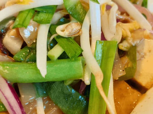 Gebakken noedels met pinda’s, groenten en tofu.