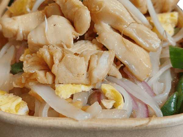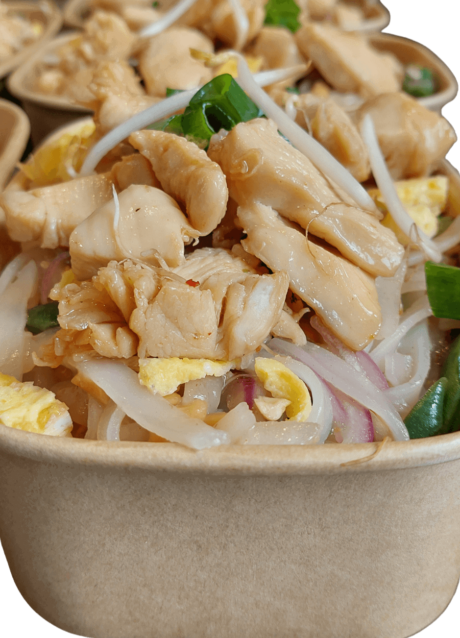 Phad Thai: Gebakken noedels met pinda’s, groenten, eieren en keuze uit malse kipfilet, tofu of garnalen. Volgens een klant de lekkerste die ze in Rotterdam heeft gegeten, want: niet saai maar smaakvol.