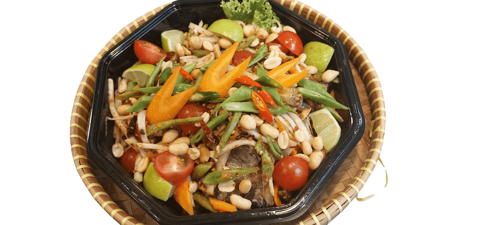 Pla Tod Krop Laat Som Tam Thai – Gebakken dorade geserveerd met zeer pittige Thaise papayasalade en keuze uit witte rijst of nasi.