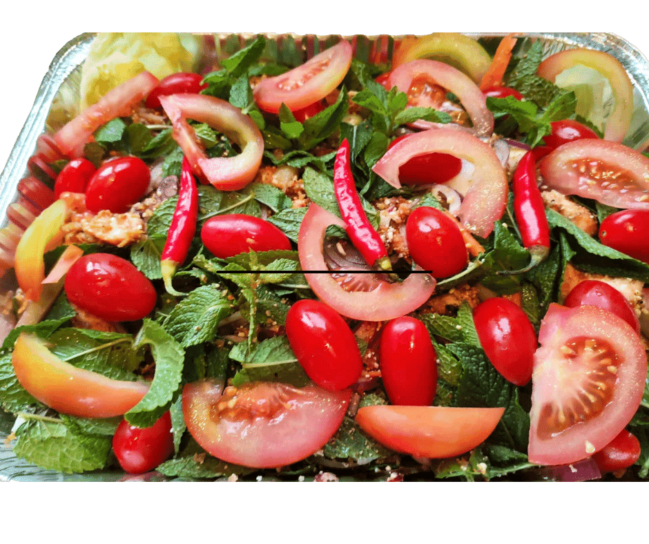 Salmon Nam Tok -Â Maatijdsalade van gebakken boterzachte zalm met citroensap, rode uien, koriander, vissaus en Thaise kruiden. Geserveerd met witte rijst of nasi.