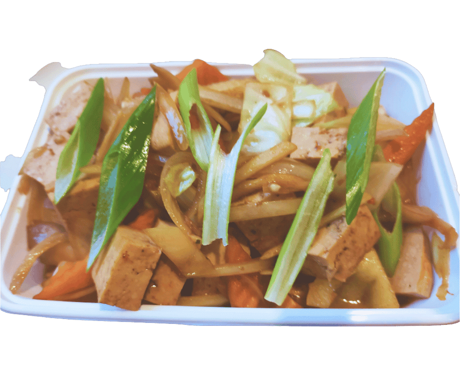 Tahu Phad King – Gebakken tofu, paprika, gember, witte uien, baby maïs, sesamzaad, oesterzwammen. Met witte rijst of nasi.