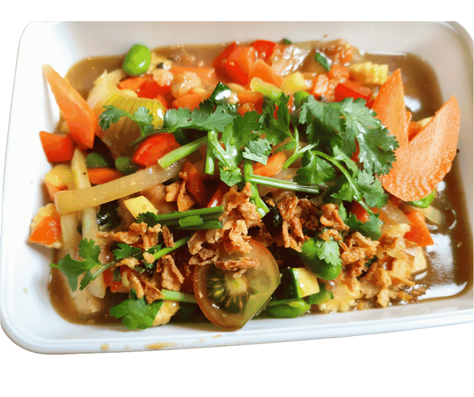 Tahu Sam Rod Gebakken tofu en groenten, overgoten met een zoetzure saus. Geserveerd met keuze uit witte rijst of nasi.