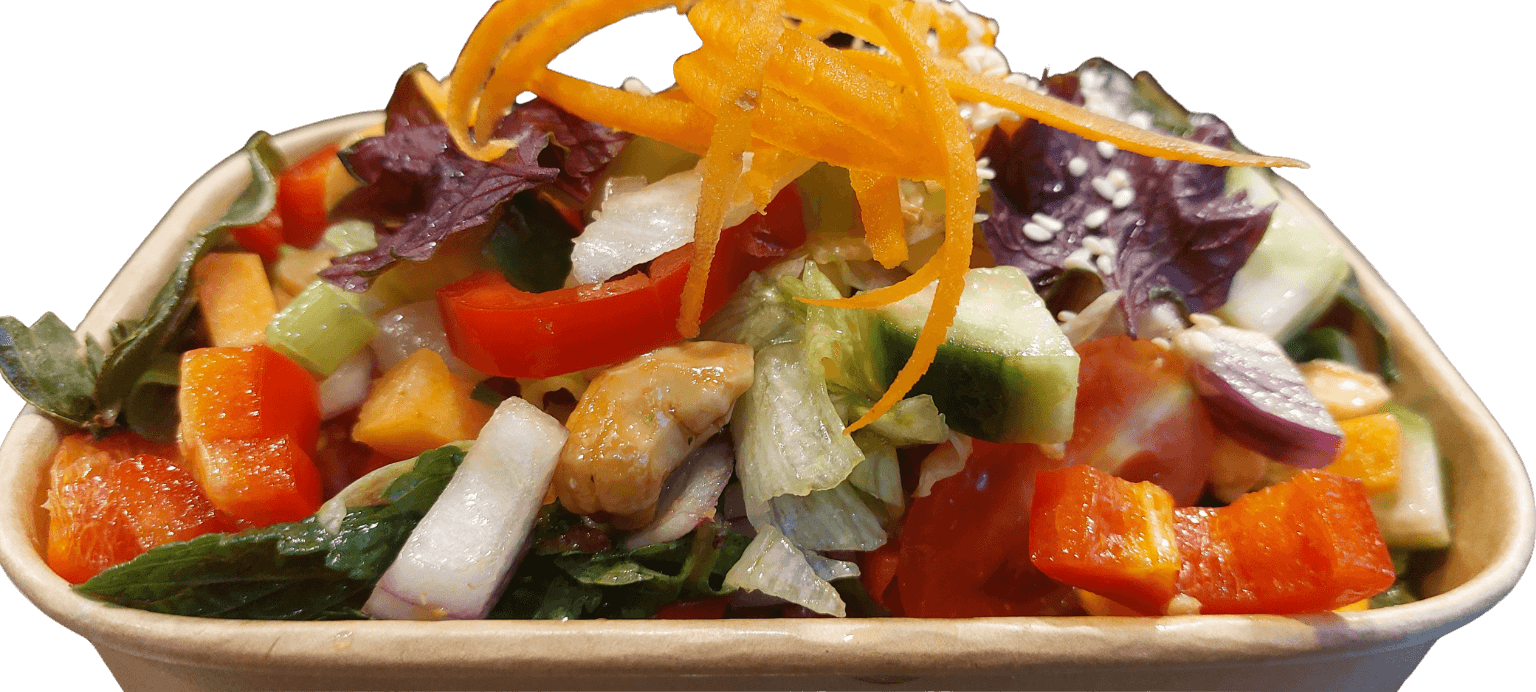 Yam Salmon Thod Samoon Prai – Maaltijdsalade van gebakken zalm of gamba’s met gember, citroengras, pinda’s, wortel, koriander, lente-uien. Geserveerd met witte rijst of nasi. Gezond genieten.