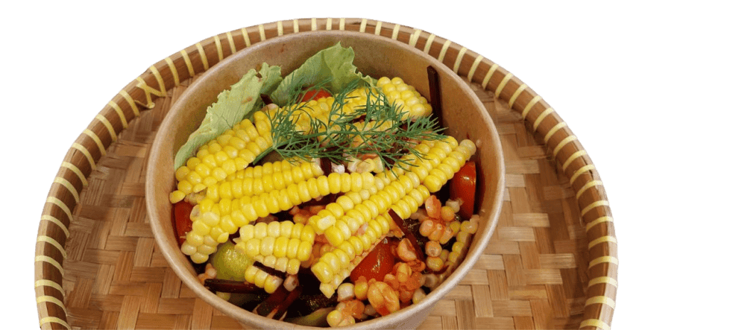 Heerlijke frisse zoetzure salade van mais, geroosterde pinda’s, tomaat, wortel, limoen, bietjes.